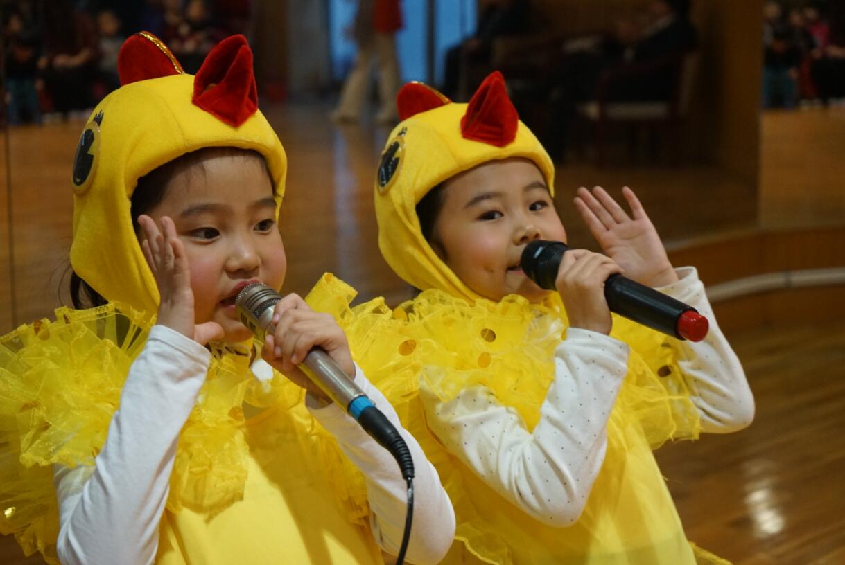 联欢活动由女青年会舞蹈队欢快的舞蹈《倍儿爽》拉开帷幕,动感的节奏和盛装的舞裙为聋哑孩子们带来了强烈的视觉冲击和韵律的感动。随后天津天韵艺术中心和天津YWCA童光合唱团的小演员演唱的《伊犁天马天上来》、《假如我是一片雪花》、《种树歌》和《拍手拍手》都受到了孩子们热烈的欢迎。当两位小鸡装扮的小朋友演唱《小鸡小鸡,落汤鸡》时,台下孩子更是欢乐,黄绒绒的“小鸡”们走到聋哑小朋友中间接受拥抱时,孩子们都争先伸出小手摸摸小鸡的头、拉拉它的小尾巴,现场充满了笑声。活动进行中,围绕着《安全的是幸福的》主题,主持人韩金良同工以有趣的方式为孩子们做了安全知识的讲解与互动,小朋友们积极配合,踊跃回答问题,清晰的语音表达,博得了全场人的喝彩,会场气氛达到了高潮。演出活动中,青友合唱团的义工演唱了《哆来咪》和《最美的歌献给妈妈》等歌曲,受到家长和老师们的热烈欢迎。最后,联欢活动在《今夜无眠》的舞蹈中落下帷幕。