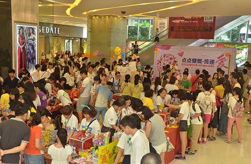 2015年8月8至9日,广州基督教青年会在五月花商业广场举办主题为“点点慷慨传递爱”的大型爱心义卖活动,共为地贫援助、广州特殊儿童运动会等公益项目筹得善款61707.77元。本次义卖活动历时两天,共动员义工450人次参与其中,充分展现了青年会义工的风采。同期访穗的美国双州青少年交流团亦亲临活动现场,感受首善羊城的爱与正能量。“既能为有需要的人出一份力,又能淘到自己喜爱的物品,我很支持这样的活动!”一位女士道出了每位爱心人士的心声。