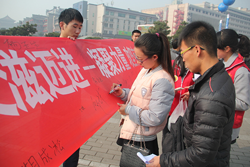 志愿者们在西安钟楼广场拉起了防艾宣传横幅,发放防艾宣传品向市民宣传如何预防艾滋病知识,志愿者们的行为吸引了很多市民驻足观看和积极参与,很多市民在宣传标语上贴红丝带并在横幅上签字以表支持防艾宣传活动。