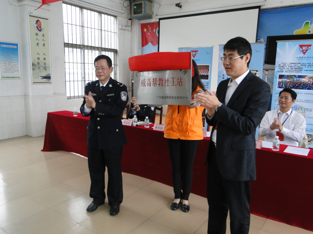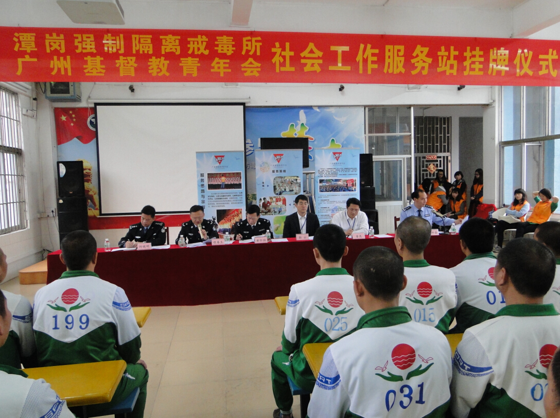 2016年3月9日,广州基督教青年会在广州市潭岗强制隔离戒毒所举行了首个戒毒帮教社工站挂牌仪式。市戒毒局、联青社等相关领导出席并向学员代表赠送礼物表达关怀之心。学员们用歌声表达了努力改造以迎接美好新生活的决心。