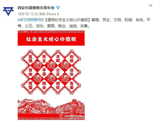 九月、十月期间,利用新媒体工具多渠道宣传“讲文明树新风”公益广告,包括:社会主义核心价值观、创建全国文明城市宣传、弘扬中华传统文化、弘扬雷锋精神、传承孝道和敬老风尚、文明礼仪、文明旅游以及宣传保护生态环境等方面主题,并落款“西安市文明办宣”字样。在西安女青年会官方微博平台共发布涉及上述主题内容微博20条。