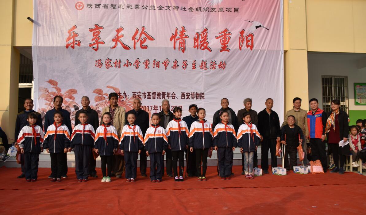 2017年10月28日,是重阳节,也是我国的第五个老人节。10月27日下午,由西安青年会主办的“乐享天伦、情暖重阳”亲子主题活动邀请到了学校驻地冯家村的12位孤寡贫困老人与冯家村小学200余名学生和部分学生的祖父母一起共庆佳节。